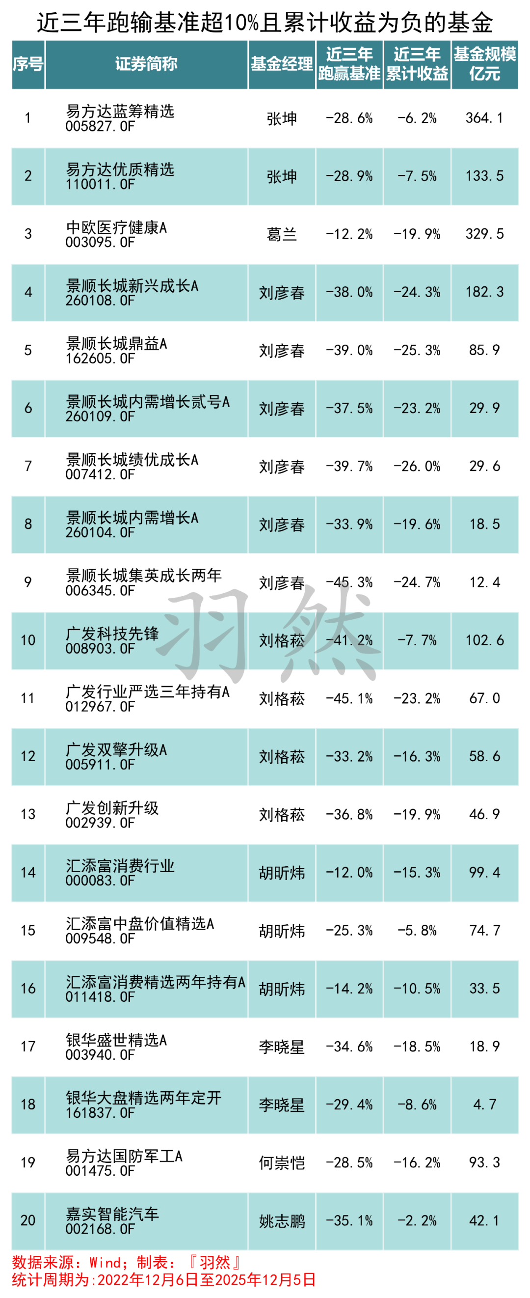 以下20只基金越过了红线:基金经理在管时间超3年,2022年12月6日至2025年12月5日期间跑输基金业绩比较基准超10%个百分点,且累计收益为负。